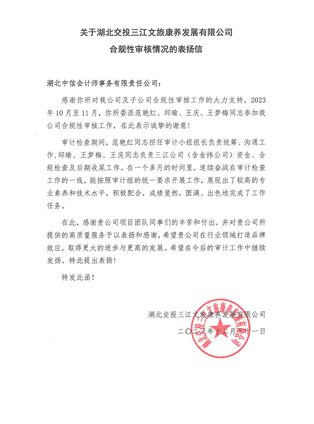 湖北三江文旅康養(yǎng)發(fā)展有限公司合規(guī)性審核項(xiàng)目表揚(yáng)信