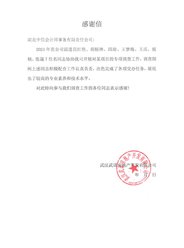 武漢武諾房地產(chǎn)開發(fā)有限公司專項(xiàng)調(diào)查項(xiàng)目感謝信