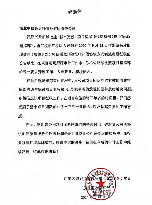 江漢區(qū)紹興片舊城改建項(xiàng)目表揚(yáng)信