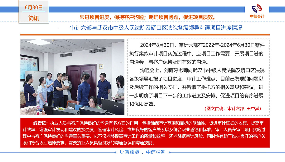 審計(jì)六部與武漢市中級(jí)人民法院及硚口區(qū)法院各級(jí)領(lǐng)導(dǎo)溝通項(xiàng)目進(jìn)度情況 -