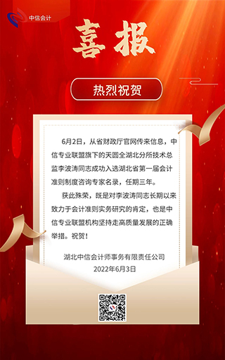 06/032022喜報(bào):李波濤同志成功入選湖北省第一屆會(huì)計(jì)準(zhǔn)則制度咨詢專家名錄