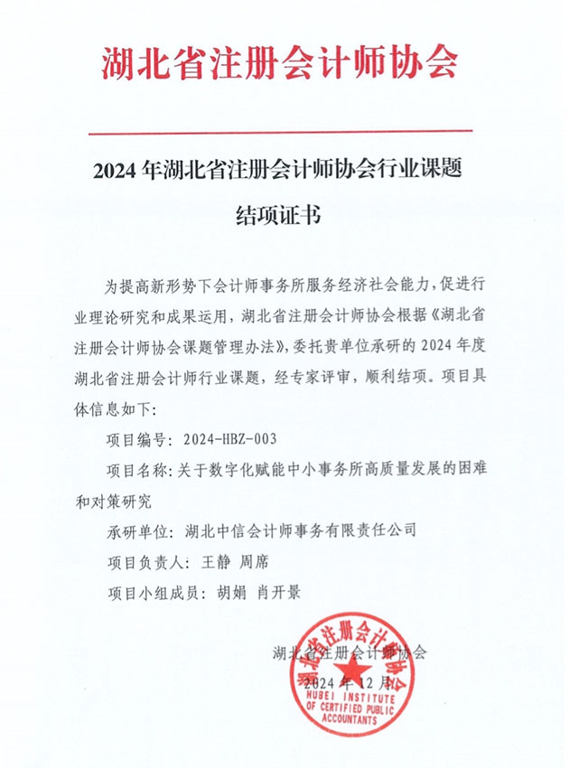 2024年湖北省注冊會計師協(xié)會行業(yè)課題結項證書