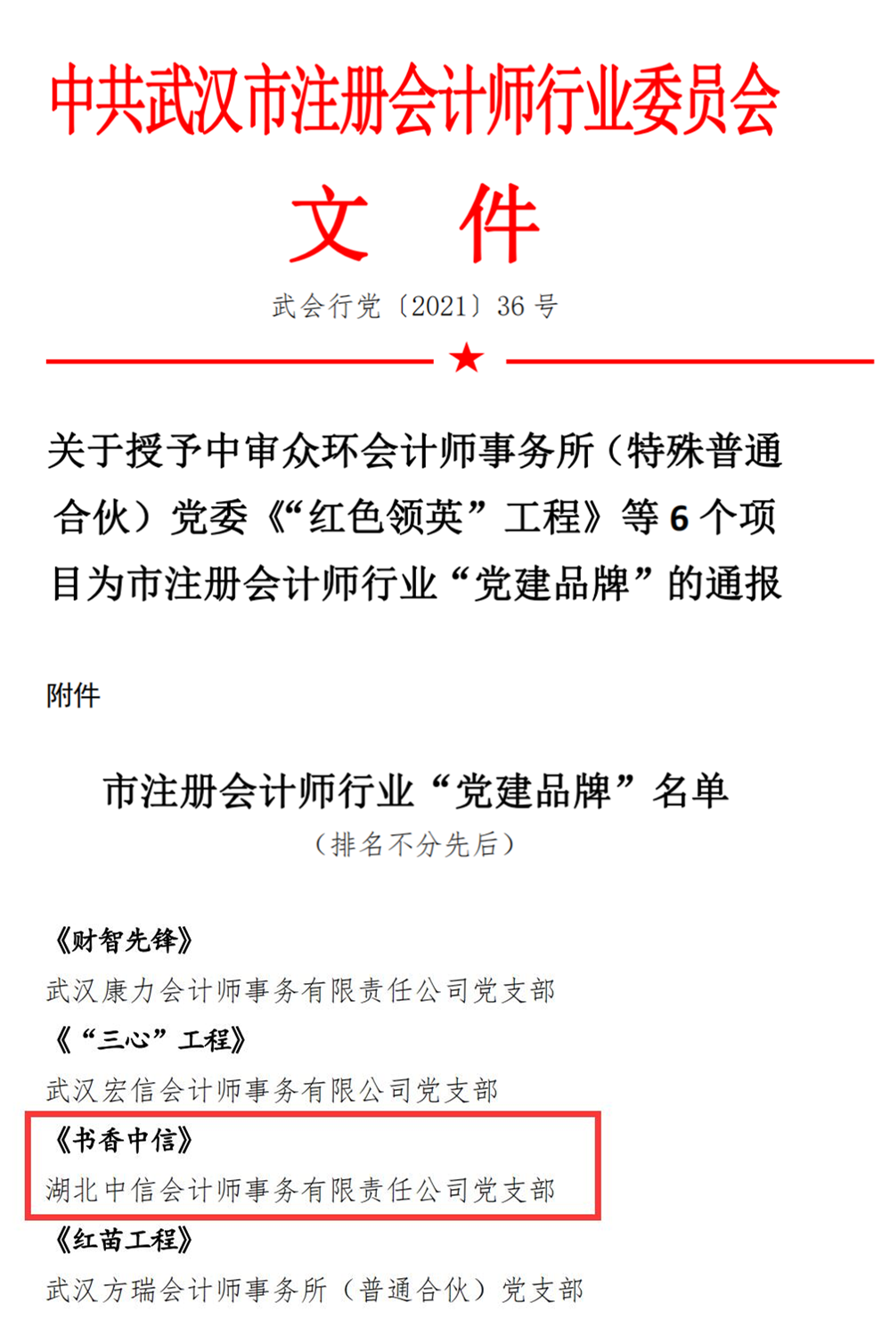 《書(shū)香中信》被授予武漢市注冊(cè)會(huì)計(jì)師行業(yè)黨委“黨建品牌”
